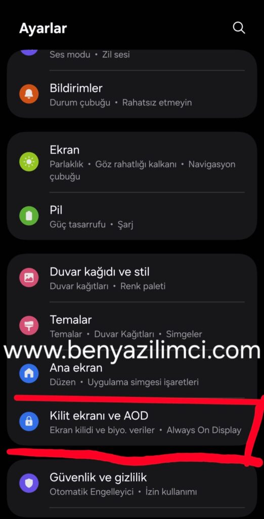 İlk olarak telefonumuzda ayarlar bölümüne girelim ve ardından “Kilit Ekranı ve AOD” seçeneğii bulup bu seçeneğe tıklayalım.